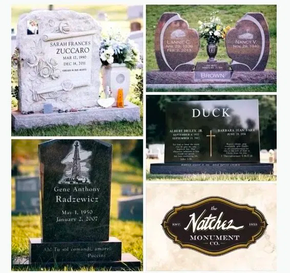 NATCHEZ MONUMENT COMPANY: Love. Beauty. Craftsmanship. 601-445-5912, 680 Hwy. 61N, Natchez. Visit our website: natchezmonument.com. Since 1953, our monument company has proudly served the Miss-Lou and its families with the very important selection of memorials ensuring quality, service and affordability. We offer a one-stop solution: able to both design and create the perfect monument, as well as set it in the cemetery. Certified Memorialist. Member Monument Builders of North America and Southern Monument Builders.