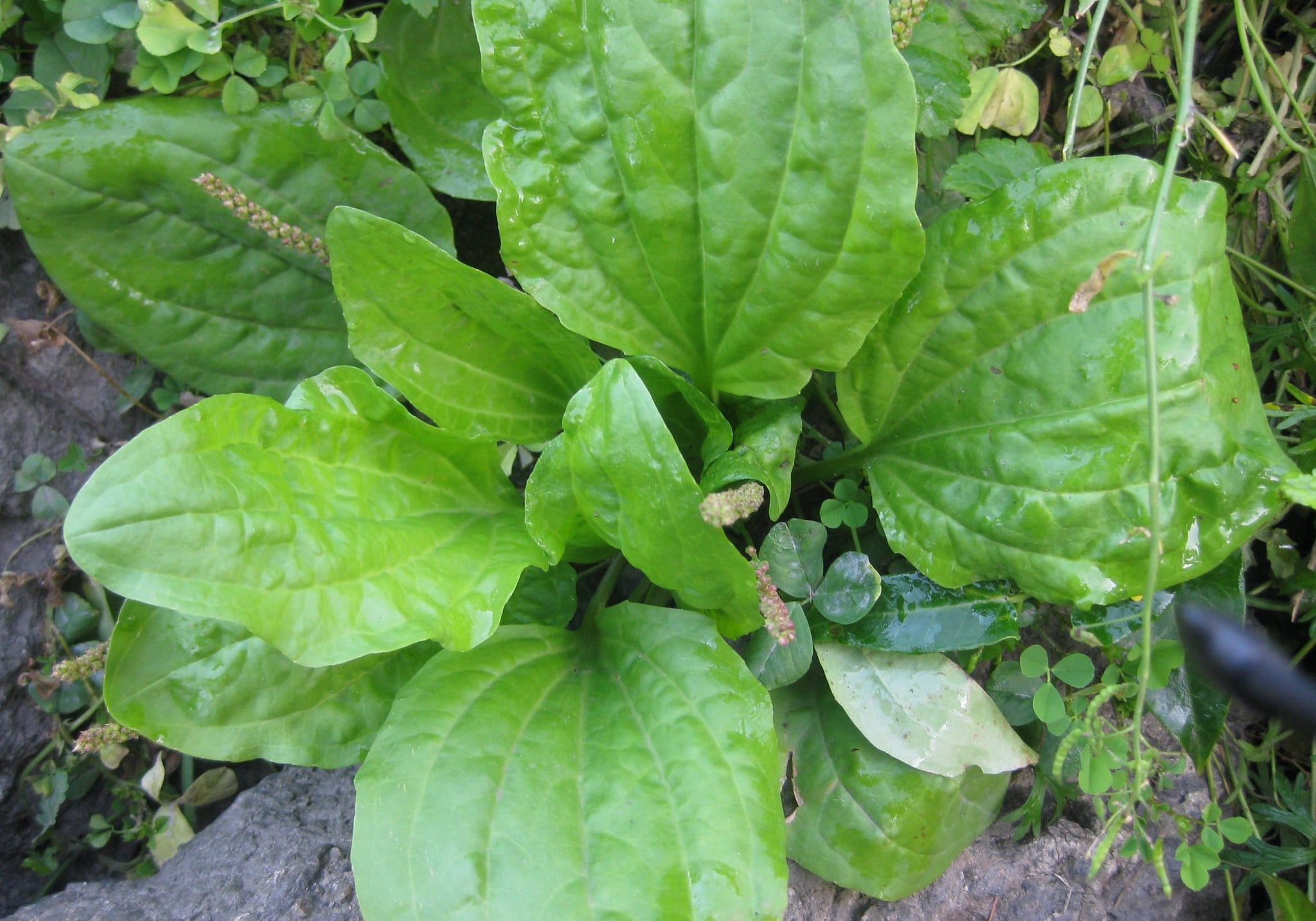 Broadleaf Plantain - is a common plant (weed) found growing in the cracks of sidewalks or along the roadside, especially during summer. The broadleaf plantain is especially helpful during the summer when mosquitoes and other biting insects are out. The entire plant is edible and young leaves can be eaten raw or cooked. Although it is somewhat bitter, the broadleaf plantain serves as a wonderful analgesic for drawing out insect venom and lessening the resulting inflammation. A tea of the plantain leaf can be ingested to help with treating chronic diarrhea and, with its high vitamin and mineral content, the tea will also replenish nutrients lost due to diarrhea. When ingested, the aucubin (an anti-microbial agent) in plantain leaves leads to increased uric acid excretion from the kidneys and may be useful in treating gout.
